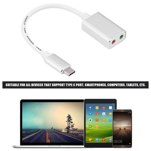 Features:The cable is made of quality materials, the port is anti-rust and anti-deformation, line is pliable and durable for long time use.Transfer USB Type C to 3.5mm jack for headphone and speaker, can filter noise and achieve the optimal reproduction of sound quality.A good solution to computer or tablet with only one audio jack, also a great alternative for broken computer sound card.Fashionable appearance with light weight and compact size, good for easy carrying and storage.Suitable for all devices that support Type C port, smartphones, computers, tablets, etc.Specification:Material: Aluminium alloy + Plastic + CopperColor Options: Gold; SilverLength: Approx. 19cm / 7.48inWeight: Approx. 21gPackage List:1 x USB Type C to 3.5MM Cable
