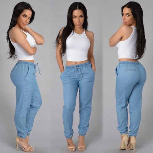 Womens Elastic Waist Casual Pants High Waist Jeans Casual Blue Denim Pants NOTE: Please compare the detail sizes with yours before you buy!!! Use similar clothing to compare with the size.Specifications: Gender:Women Material:Polyester fiber Item Type:Denim Pants ,Casual Fit Type:Straight Waist Type:High Waist Thickness:Standard Pattern Type:Solid Style:Casual Package include:1*Women Pants(blet) Size Details: Size:LWaist:70cm/27.6\" Hips:102cm/40.2\" Length:97cm/38.2\"