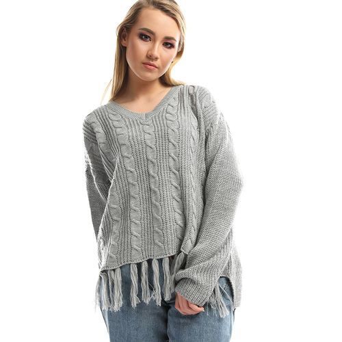 Ravin Jumper is crafted from lightweight cotton with a signature silhouette comprised of a loose Round and long sleeves. Featuring Fringes Hem With Low To High Style , Perfect piece for winter cold nights . ,Grey pullover with fringes that can elevate your everyday outfit with jeans and sneakers to trendy nice look or can be paired with skinny and boots for a simple elegant look for an outing with the girls