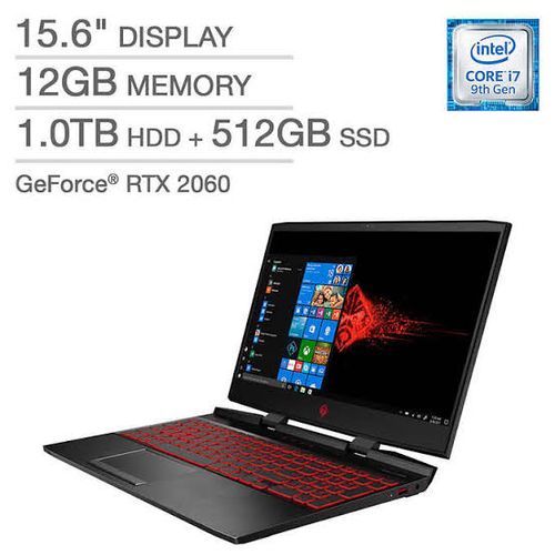 Power designed to propel you forwardWith NVIDIA® graphics, a high-performance Intel® Core™ processor, and an enhanced thermal solution – you’ve got the power to hone your skills anywhere.Every last detail in your sightGet lost in an immersive narrow bezel display with breathtaking resolution. A zoned backlit keyboard with 26-key rollover is strategically designed to accelerate your gaming reflexes.NVIDIA® GeForce RTX™ 2060 graphicsEnjoy real-time ray tracing in games and get all the power you need for a fast and smooth gaming experience.Windows 10Do great things confidProcessor & Memory:9th Gen Intel® Core™ i7-9750H 6-Core Processor 2.6GHz12GB DDR4 2666MHz SDRAMDrives:1TB 7200RPM SATA Hard Drive + 512GB PCIe NVMe M.2 Solid State DriveNo Optical DriveOperating System:Microsoft® Windows 10 (64 bit)Communications:Intel® Wi-Fi 6 (2×2/160) Gig+ and Bluetooth® 5.010/100/1000 Gigabit EthernetHP WideVision HD Webcam with Integrated Dual Array Digital MicrophoneGraphics & Video:15.6\" WLED-backlit IPS Anti-Glare FHD (1920 x 1080) Display6GB NVIDIA® GeForce® RTX 2060 GraphicsAudio:Bang & Olufsen with Dual SpeakersKeyboard:Full-size island-style Customizable 2-Zone Dragon Red backlit keyboard with numeric keypad and Touchpad with Multi-touch Gesture SupportRed Legend Layout, 26-Key Rollover, Anti-Ghosting Key TechnologyPorts:1x USB 3.1 Gen 2 Type-C with Thunderbolt™ 31x USB 3.1 Gen 1 Type-A (HP Sleep and Charge)2x USB 3.1 Gen 1 Type-A (Data Transfer Only)1x HDMI 2.01x RJ-45 (LAN)1x AC Smart Pin1x Multi-Format Digital Media Card Reader1x Headphone-out/Microphone-in combo jackPower Supply:4-Cell 70Whr Lithium-ion Polymer Battery