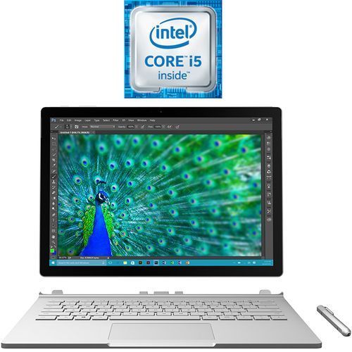 Surface BookUltra-thin, meticulously crafted, with incredible screen resolution. This is the ultimate laptop.The ultimate laptop.We all have greatness in us. And with the right tools, there are no limits. Be bold. Inspire. Do something special. Introducing the ultimate laptop, Surface Book. Ultimate versatility.Surface Book transforms into three different configurations, adapting to the way that you work and the places where you create.Powerful laptopThe first full laptop has arrived in the Surface family. Surface Book is a powerful laptop with a full sized, backlit keyboard for fast and natural typing. Portable clipboardThe 13.5\" PixelSense™ display detaches easily from the keyboard to become a thin, light tablet that works perfectly with OneNote and Surface Pen. Creative canvasTurn the screen around and reattach it to use Surface Book like a creative canvas. By reconnecting it to the keyboard, you unlock its full creative power in a pen first mode.Ultimate performance.Surface Book is built to be a creative workhorse. Combining a 6th Gen Intel® Core™ i5 or i7 processor with up to 16GB of memory and an optional discrete graphics chip.Graphic horsepowerWith an optional discrete graphics chip, Surface Book is built for even the most intensive creative tasks. Serious creativityUse the multi-touch PixelSense™ screen and Surface Pen to create with all the desktop software you already use, like Adobe® Photoshop® and Illustrator. Mobile studio Surface Book is the creative professional\'s laptop, designed to power through professional grade photo and video editing.Runs Windows & Office perfectly.The best Windows ever, with lots of new features you\'ll love. Like innovations in security, personalization, and productivity.Full OfficeSurface Book works perfectly with the full suite of Office products, driving your productivity to new heights. Markup webpagesWrite directly on webpages with Surface Pen in the all-new Microsoft Edge browser and share your notes easily. Limitless appsSurface Book has all the power you\'ll need for even the most demanding creative apps. Use Adobe® software with a pen or mouse. Meticulously crafted.Surface Book\'s one-of-a-kind hinge folds and detaches to transform from laptop, to clipboard mode, and then into a creative canvas.One click to CortanaClick and hold the top of Surface Pen to activate Cortana, your truly personal digital assistant.One click to OneNoteWith one click of Surface Pen, a blank OneNote page appears for quick notes.Rest your handWith Palm Block technology you can rest your hand on the screen to write naturally, just like a pad of paper.Detachable Keyboard.Surface Book uses Muscle Wire® to hold its screen in place securely, while still allowing it to detach perfectly with the push of a button.PixelSense™Our PixelSense™ is a true-to-life screen technology designed for beauty, touch and pen.Natural writing experience.Surface Pen combines 1024 levels of pressure sensitivity with low latency for a real pen on paper feeling.Surface Book in action.Thavius Beck brings Surface Book into his creative process to make his music. Use it like a clipboard.Grab your screen and go. Surface Book\'s screen detaches so you can take it anywhere.Ideas in action.Use it as an awesomely powerful laptop to bring your ideas to life.Creative powerhouse.See how Jordan Crane uses Surface and the power of full desktop software to perfect his illustrations.Technical Specifications:Processor6th Generation Intel® Core™ i5-6300U Processor, 2.4GHz (3M Cache, up to 3.0 GHz, # of Cores: 4)MemoryInstalled Memory: 8GB RAM LPDDR3 SDRAMDisplayScreen: 13.5” PixelSense™ DisplayResolution: 3000 x 2000 (267 PPI)Aspect ratio: 3:2Surface Pen enabledTouch: 10 point multi-touchGraphicsGraphics Processor: Intel® HD GraphicsGraphics Video RAM: SharedStorageHard Drive: 256 GB Solid state drive (SSD)Inputs and Outputs2 x USB 3.0 Headphone/microphone combo jackMini DisplayPort2 x Surface ConnectMemory Card Reader (SD Card, SDHC Card, SDXC Card)CameraWindows Hello face sign-in camera8 Megapixel (rear), 5 Megapixel (front) HD camera (front-facing)Audio and SpeakersStereo speakers, two microphonesWireless/NetworkingWi-Fi: IEEE 802.11 a/b/g/n/ac compatibleBluetooth Wireless 4.0 technologySensorsAccelerometer, ambient light sensor, magnetometer, gyro sensor, hall sensorSoftwareOperating System: Windows 10 ProfessionalSecurityTPM chipEnterprise-grade protection with Windows Hello face sign-inExteriorExterior Casing: Magnesium alloyColor: SilverPhysical buttons: Volume, PowerBatteryBattery Life: Up to 12 hours of video playbackBodyDimensions: 12.3 in x 9.1 in x 0.9 inWeight: 3.47 lbs