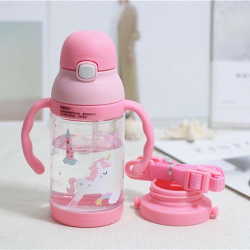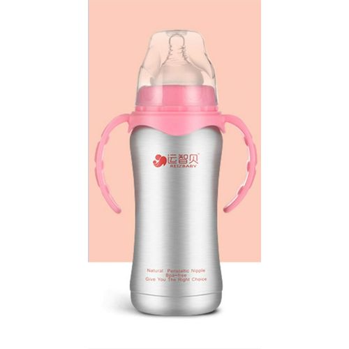 Material Stainless steel + PP Size 240ML Theme Pink blue green,240ml Function Baby Bottle Product Feature 1. Stainless steel material, anti-hot and durable 2. Durable material, breakingproof, 3. Handle design, convenient for mommy and baby to hold 4. Widemounthed bottle is easy to clean 5. 3 caps available, both water bottle and drinking bottle 6. Keeping water warm, convenient to feed baby outdoor Package Package: 1*bottle(3 caps)