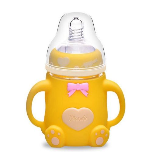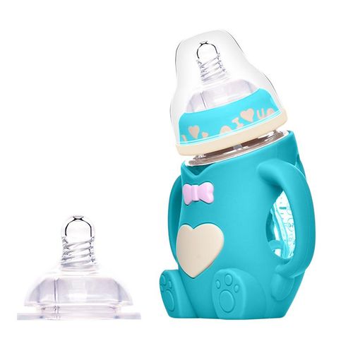 Baby Feeding Bottles Explosion-proof Infant Glass Milk Bottle Non-toxic Feeding Kids Cup Straw Handle Cartoon Baby Supplies Features: Made of food grade silicone material, non-toxic, safe to use. Squeezable bottle, not easy to break and scratch, durable to use. Anti-flatulence gas intake system of the nipple protects your baby from vomiting milk. Specially designed cover which can fix the nipple well helps to prevent milk leakage and dust pollution. Will not be damaged in mammals, and as regularly repeated sucking milk. Has the function of very soft can elongation at the baby's tongue can like suck breast milk when free. Description: Like breast uplift design, make baby open your mouth can fully achieve the purpose of sucking motion. Glass bottles is easy to clean. Soft and elastic nipple, milk flows smoothly and baby can easily suck. Mini size of the bottle, portable to use. Specification: Material: glass+silicone Color: blue, yellow, purple, pink, coffee color, orange Capacity: 160ml Size: 140*100mm Package included: 1 x milk bottle