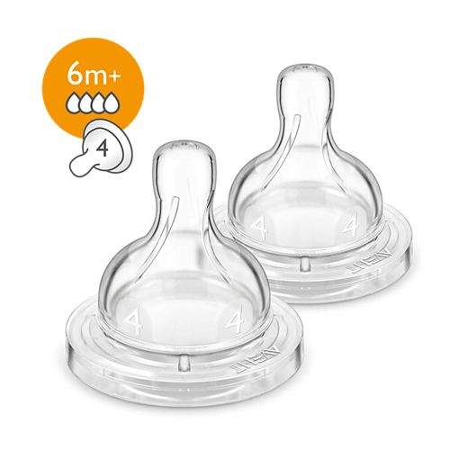 Clinically proven to reduce colic and discomfort* 2 pcs Fast flow teat 6m+ Anti-colic valve proven to reduce colic* Our anti-colic valve is designed to keep air away from your baby\'s tummy to reduce colic and discomfort. As your baby feeds, the valve integrated into the teat flexes to allow air into the bottle to prevent vacuum build up and vents it towards the back of the bottle. It keeps air in the bottle and away from baby’s tummy to help reduce colic and discomfort. 60 less fussing at night* Philips Avent Anti-colic bottle reduces fussing. Babies fed with Philips Avent Anti-colic bottles experienced 60 less fussing at night, than babies fed with a competitor’s anti-colic bottle.* Ribbed texture prevents collapse for uninterrupted feeding The teat shape allows secure latch and the ribbed texture helps prevents teat collapse for uninterrupted, comfortable feeding. Different teat flow rates available The Philips Avent Anti-colic bottle range offers different teat flow rates to keep up with your baby\'s growth. Remember that age indications are approximate as babies develop at different rates. All teats are available in twin packs: Newborn, Slow, Medium, Fast and Variable Flow, and Thick feed. This teat is BPA free Philips Avent Anti-colic teat is made of BPA free material (silicone). Compatible range from breastfeeding to cup Mix and match our breast pump, bottle and cup parts, and create the product that works for you, when you need it!