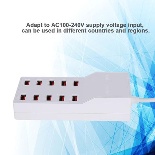 Features:1. Adapt to AC100-240V supply voltage input, can be used in different countries and regions.2. Fit for Huawei SCP/FCP, Fit for Qualcomm QC3.0, BC1.2, Fit for Samsung AFC, Fit for iPhone 5V2.1A and other charging protocols, supporting a wider range of devices 3. 10 mobile phones can be charged at the same time, solving the trouble of charging less sockets.4. With automatic recognition, plug and play, no need to press5. The shell is made of ABS and PC flame retardant material, which is resistant to high temperature and is not afraid of falling.6. Two 2.4A, four 2.1A pad universal intelligent charging port, four 1A mobile phone charging port, 10 USB charging port, intelligent current output, efficient shunting to charge the device, and overall output 10A interface. Specification:Condition: 100 newItem Type: 10 Port USB Charging StationModel: T8Input Voltage: 100-240V ACInput Frequency: 50-60HzOutput Voltage: 5VOutput Current: 10AOutput Power: 100WWork Efficiency: 70Heat Dissipation Method: Safe heat dissipation aluminum sheetAutomatic Identification: Automatic identification of voltage and current according to equipmentMaterial: PC+ABS Flame retardantColor: WhitePower&Plug: US Plug 100-240V(please kindly make a note if you need any plug adapter) Package List:1 x Charger