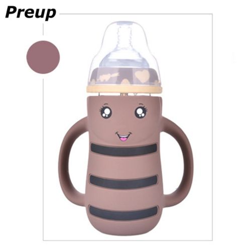 Cartoon Wide Mouth Glass Children Cup Anti-Colic Infant Supplies Drinking Water Bottle with Straw for Feeding Baby Bottles New Features: Made of food grade silicone material, non-toxic, safe to use. Anti-flatulence gas intake system of the nipple protects your baby from vomiting milk. Specially designed cover which can fix the nipple well helps to prevent milk leakage and dust pollution. Will not be damaged in mammals, and as regularly repeated sucking milk. Has the function of very soft can elongation at the baby's tongue can like suck breast milk when free. Description: Like breast uplift design, make baby open your mouth can fully achieve the purpose of sucking motion. Soft and elastic nipple, milk flows smoothly and baby can easily suck. Mini size of the bottle, portable to use. Specification: Material: glass+silicone Color: yellow, pink, blue, purple, coffee color, orange Capacity: 240ml Size: 100*160mm Package included: 1 x milk bottle