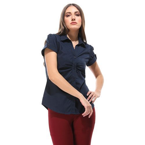 This simple shirt is an ultimate wardrobe essential for those off-duty days. Featuring a Short sleeves and Buttons closure..Step out with confidence this weekend in this top paired with strap heels and leather pants Featuring navy color, and plunge neckline. or style it with skinny and loafers for an everyday work outfit