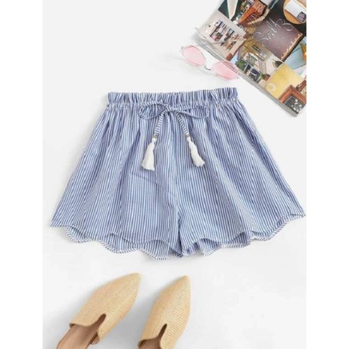 Striped Drawstring Waist Wave Edge Shortssize : Mcolor : blue / whiteStyle:CasualColor:BluePattern Type:StripedDetails:Drawstring, Fringe, ScallopSeason:SummerComposition:100 PolyesterFabric:Non-stretchFit Type:LooseWaist Type:High WaistClosure Type:Drawstring Waist, Elastic Waist